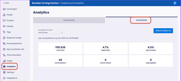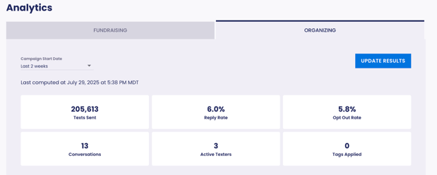 Navigate to your Analytics page located on the left-hand menu. You can choose to view analytics for either Fundraising or Organizing.