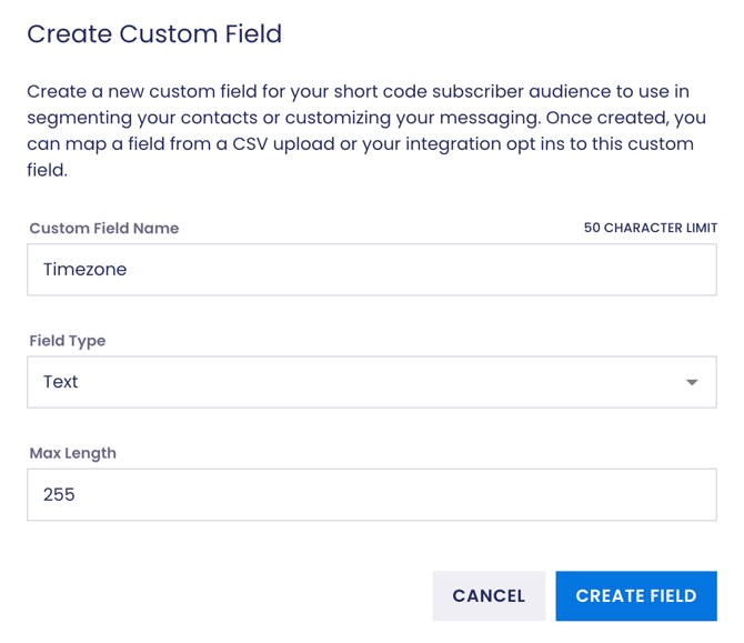 Here you can add custom fields to your audience to append your contact data For example, you can add the timezone contacts live in to segment your list later to include or exclude contacts in future text campaigns based on where they live.