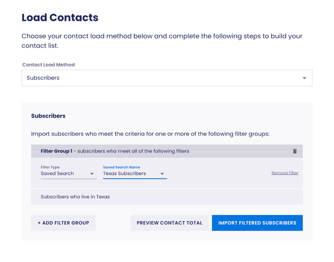 On the Load Contacts step, choose the Contact Load Method: Audience, choose the audience you want to use and click either Filter Contacts or Import Contacts