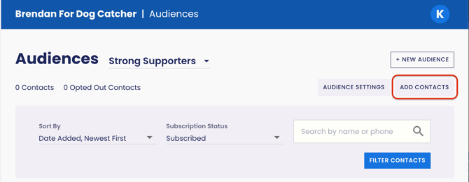 - In your Audiences page, click on the Add Contacts button on the top right.