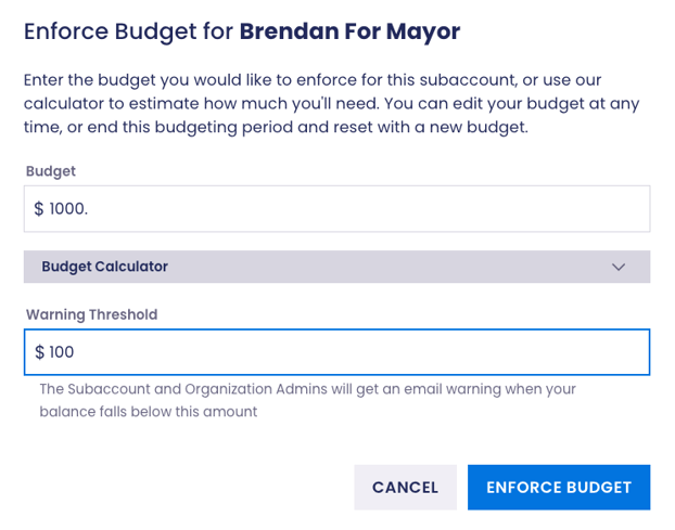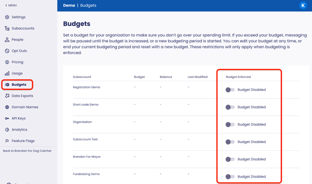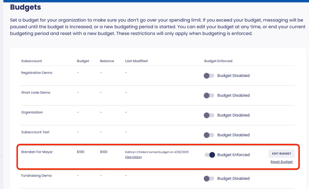 The Budgets feature allows Organization Owners to turn on budgets for some or all of their subaccounts and to set a spending cap. If the spending cap is reached or exceeded, sending will be paused for the subaccount until the budget is turned off, the budget is reset to create a new budgeting period, or an additional budget is allocated.