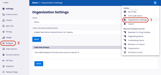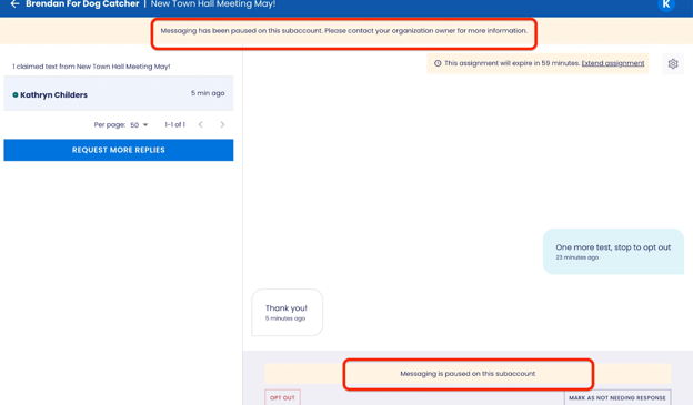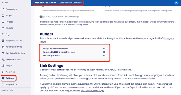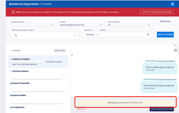 Texters cannot access or view the Budget. If a subaccount has reached or exceeded the budget the Texter will see a Paused Messaging Banner and they will not be able to send.