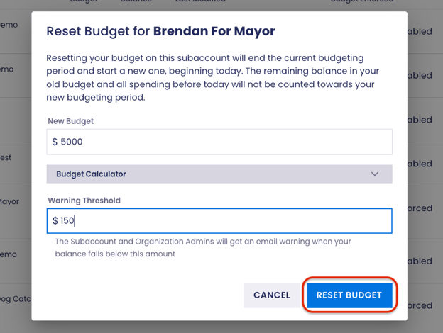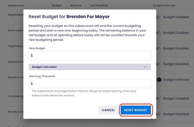 Resetting the budget creates a new budgeting period, which overrides any existing budget balance.