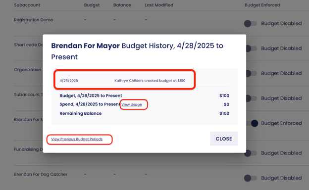 Here you can see all actions taken in the current budget period. You can also access a link to the Usage Page View and the Previous Budget Periods as well.