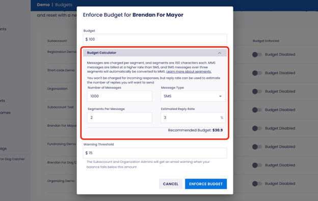 Step 7: (optional) If needed, use the Budget Calculator to calculate the budget amount based on estimated messages