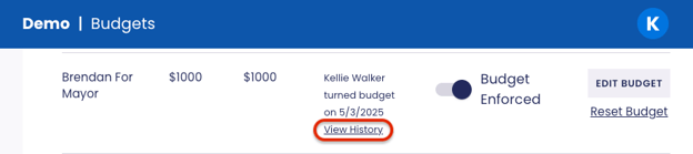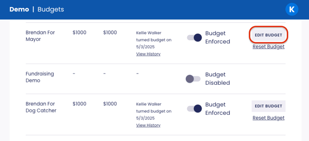 To edit a budget, select Edit Budget on an Enforced Budget.