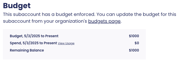 Note: Only Organization Owners and subaccount admins are able to view Budgets and their balances. To view a Budget, navigate to your subaccount Settings from the global sidebar. Scroll down to the Budget section where you will see a table reflecting that subaccount’s current budget and balance.