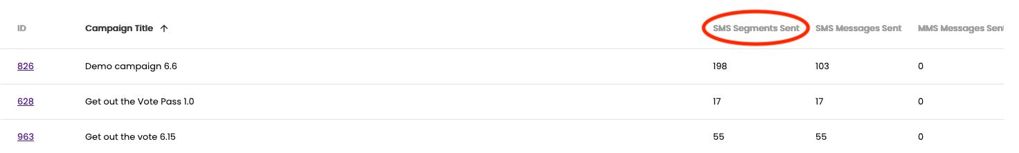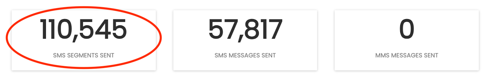 - SMS segments (not messages - each segment is 153 characters **we recommend keeping each message under 4 segments**)