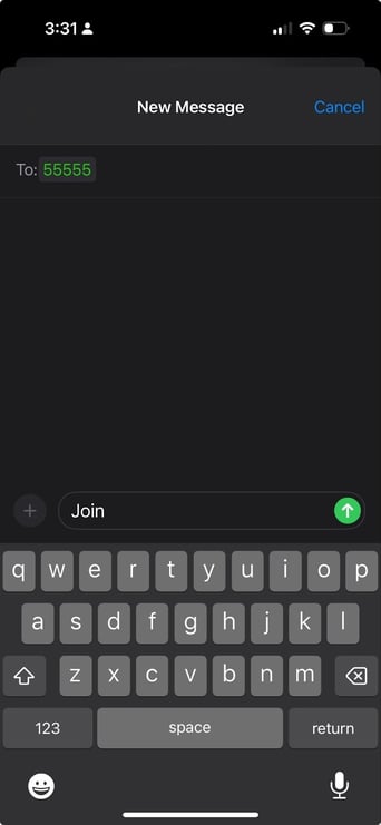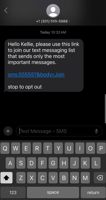 In the above example, 55555 is the Short Code number and “Join” is the opt-in keyword that will pre-populate in the body of the text message.