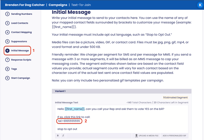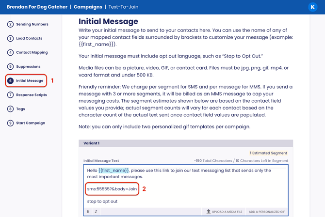 1. Navigate to the Initial Message stage of your text campaign and write your desired message.