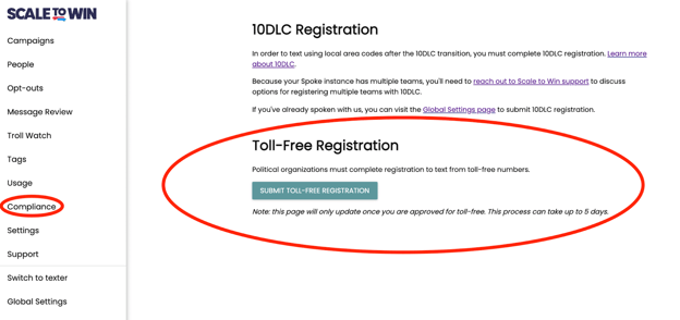 Account Owners will find the toll-free registration form on the Spoke "Compliance" page. Click on "Submit Toll-Free Registration" to access the form.