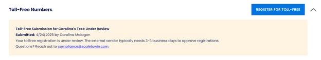Image above: Account Owners can access the form to register for toll-free on the Compliance page.