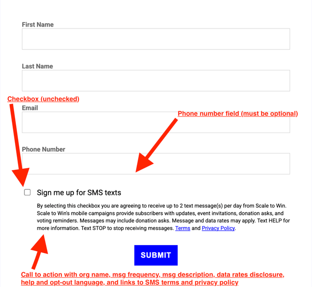 | Sample Call to Action: By selecting this checkbox you are agreeing to receive up to 2 text message(s) per day from Scale to Win. Scale to Win's mobile campaigns provide subscribers with updates, event invitations, donation asks, and voting reminders. Messages may include donation asks. Message and data rates may apply. Text HELP for more information. Text STOP to stop receiving messages. |