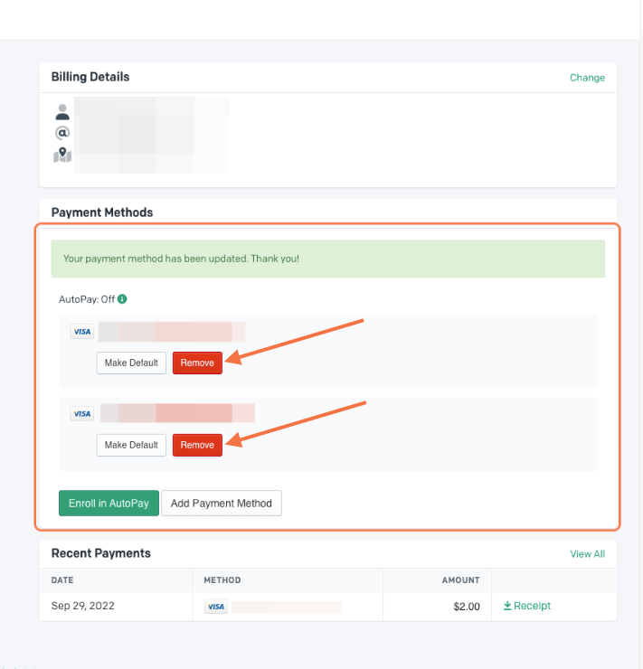 You can remove payment methods by clicking the drop down next to each payment method and clicking remove. **This is only available if you have more than one payment method on file.**