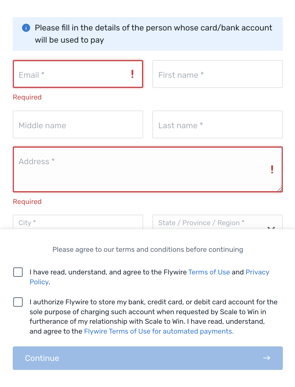 The first box will prompt you to enter the contact information of the person completing the transaction. You will be able to enter the specific bank account information in the next box.