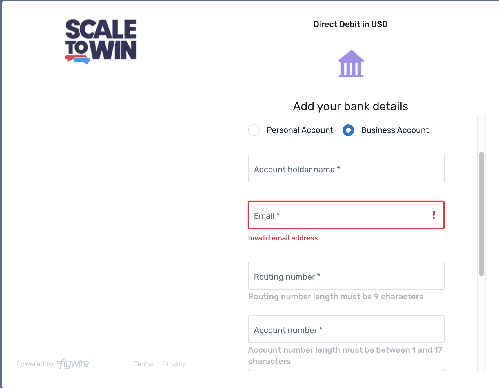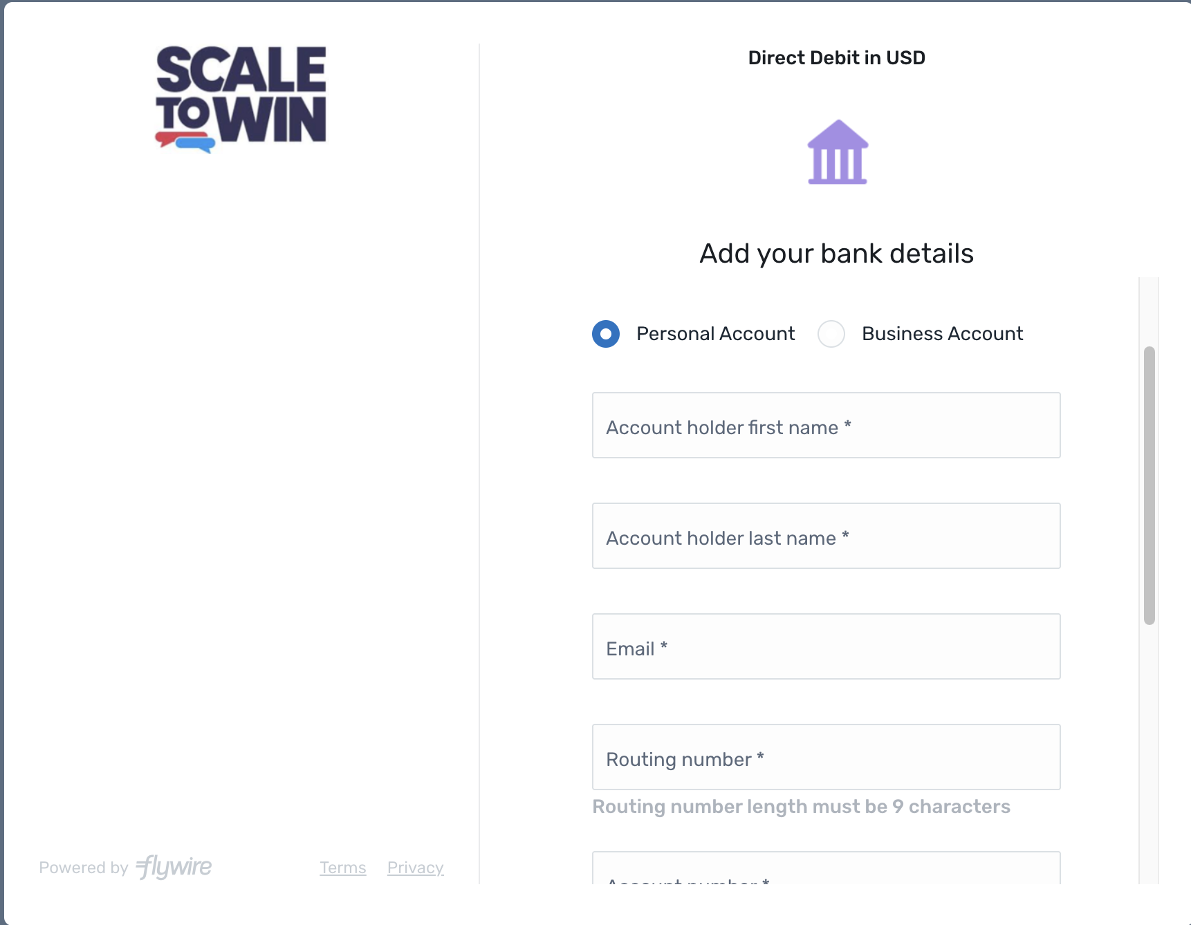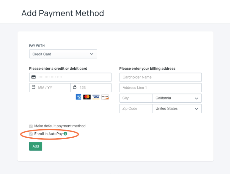 This will prompt you to “Add Payment Method” once again. You cannot select an existing payment method to enroll in AutoPay. You must re-enter it and make sure to check the box for “Enroll in AutoPay”. Please be aware that this option will only be available if we have enabled AutoPay for your account. Again, feel free to send an email to billing@scaletowin.com if you do not see this option and would like it turned on.