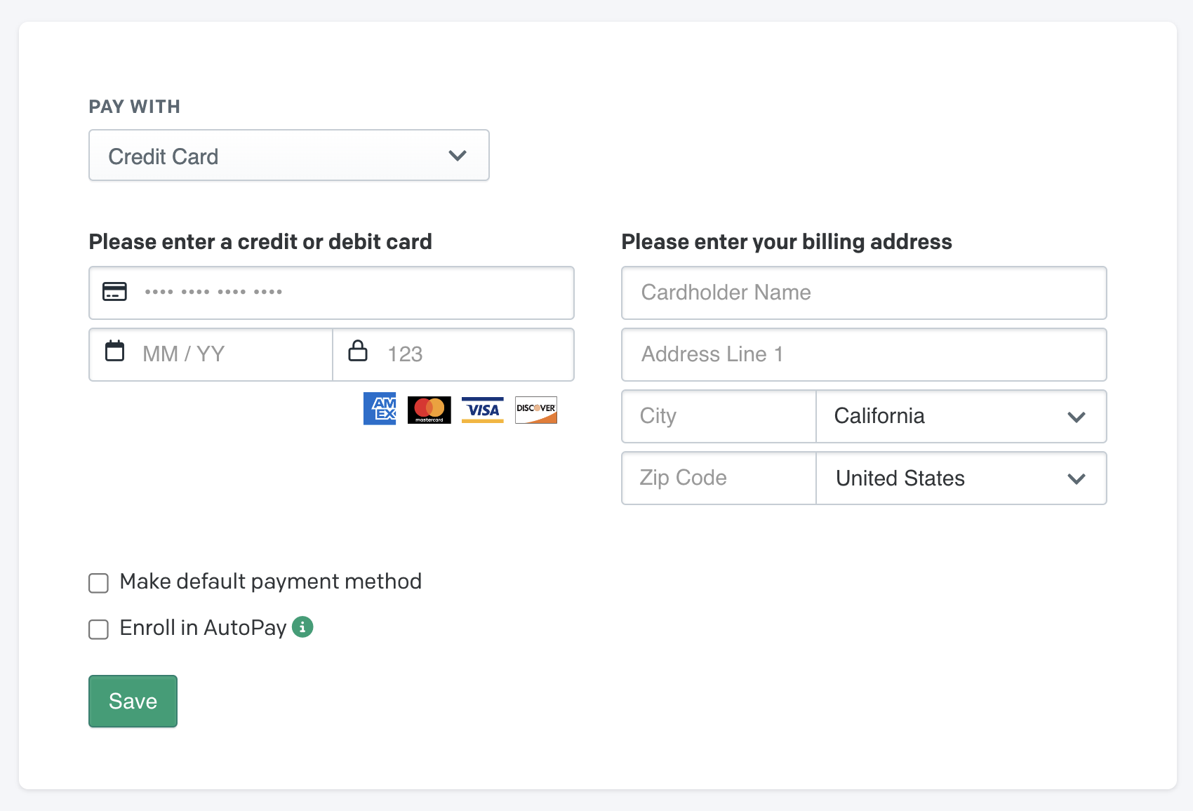 To add a new card select “Credit Card” from the “Pay With” dropdown menu. Fill out the missing fields and make sure the Cardholder Name is correct. You can make this your default payment or enroll in autopay. **Please note: Selecting “Make Default Payment Method” will delete any other payment method on file.**