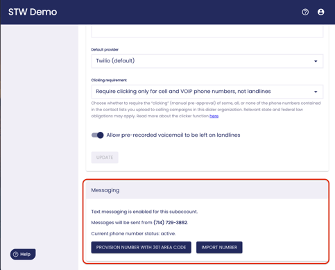 - Fill out and submit the Enable Dialer Text Messaging form linked in the Messaging section. Choose to send texts from either a local phone number (10DLC) or a Toll-Free number. If selecting a local number, you can list your top three preferred area codes.