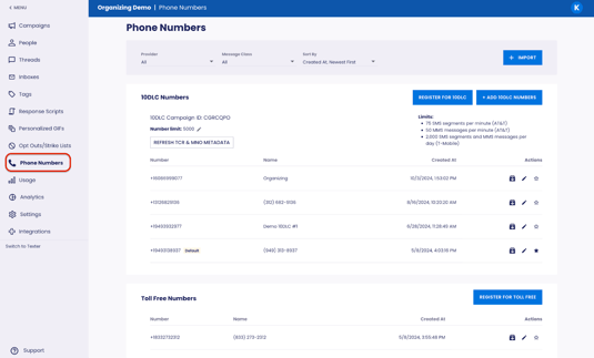 If your organization has Scale to Win Text, you can check the status of your 10DLC and Toll-Free registration on the Phone Numbers page in the right-hand menu. This page displays all active or pending registrations for both 10DLC and/or Toll-Free numbers.