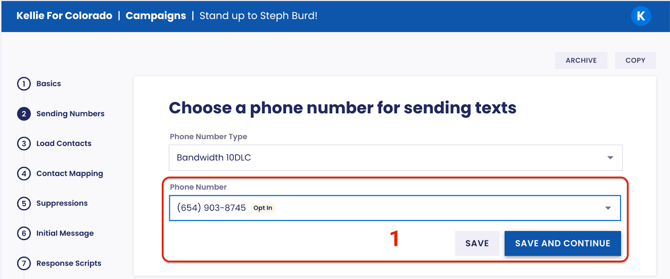 1. In the Sending Numbers step of building your campaign, select your opt-in 10DLC or Toll-Free number from the Phone Number menu, then click Save And Continue.