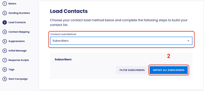 2. In the Load Contacts step select Subscribers from the drop-down menu and click Import All Subscribers.