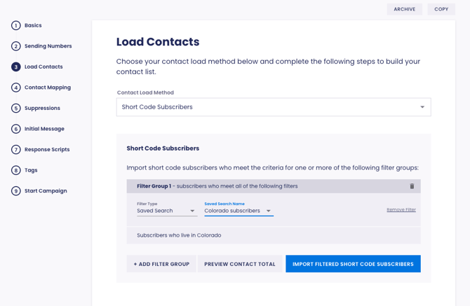 - On the Load Contacts step, choose the Contact Load Method as Short Code Subscribers and click Import Filter Short Code Subscribers