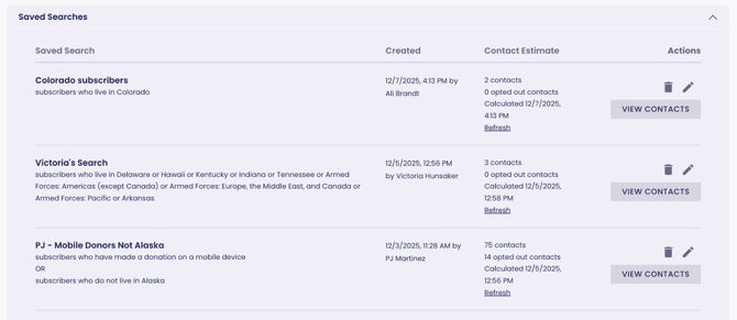 - The contact estimate the last time the Saved Search was applied (contacts and opted out contacts) and the date and time that it was last calculated