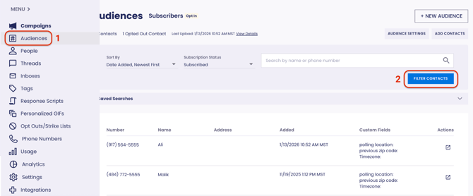 Note: When filters are applied, you will see the number of contacts that fit the filter criteria as well as the number of opted out contacts.