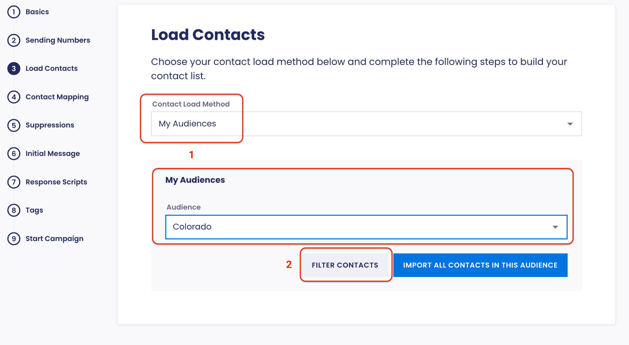 - On the Load Contacts step, choose the Contact Load Method: My Audiences and select the Audience you want to target form the drop down menu.