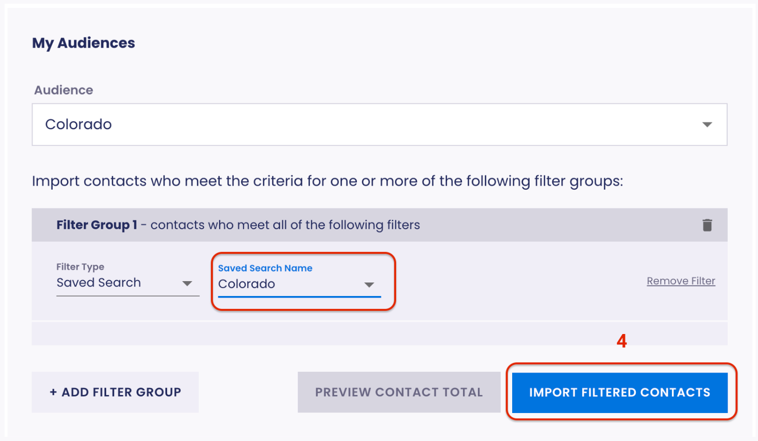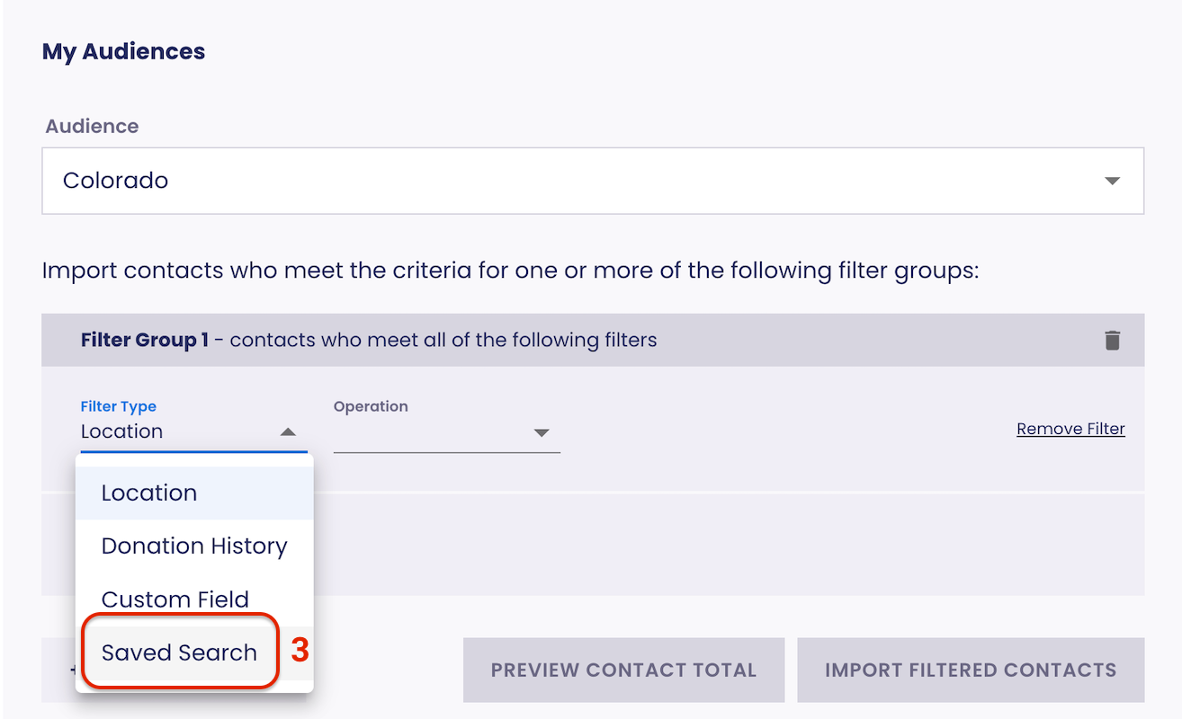 - Select the name of your Saved Search, then click Import Filtered Contacts.