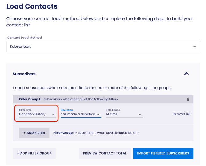 Once donation history is enabled, you can import subscribers into your campaign through the Load Contacts step by utilizing the Donation History Filter Type.