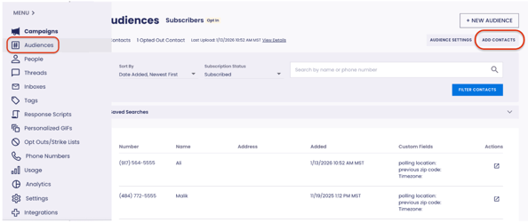 1. Navigate to your Audiences page and click the Add Contacts button.