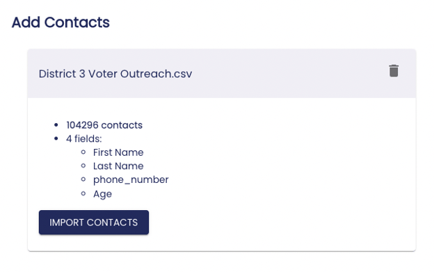 The next step of building your call campaign is to add the contacts that you want to dial. This is the list of the hundreds, thousands, or even millions of voters, supporters, or other contacts with whom you want your callers to talk.