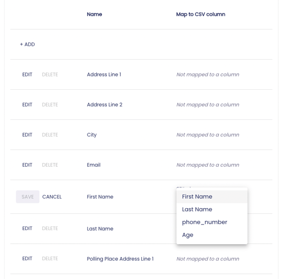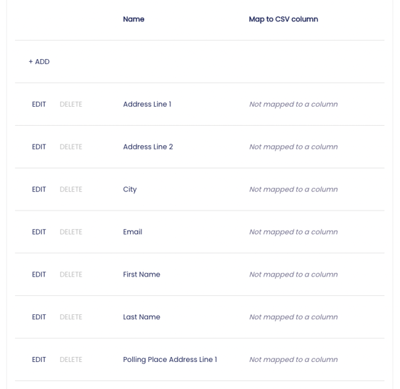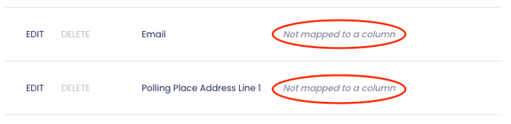 - If there are fields you did not include in your contact list (e.g., Address, Email, Polling Place Name), simply don’t map them to one of your column headers. The row on which these fields are listed will continue to say “Not mapped to a column.”