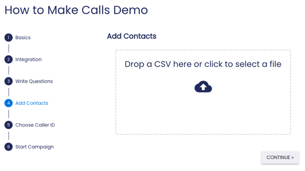 The “Add Contacts'' step in the campaign creation process, where you can drag and drop a CSV or click to select a file from your computer.