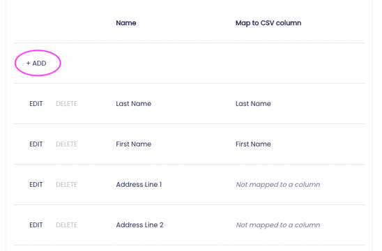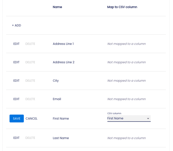 To do this ‘mapping,’ find a default Contact Field on the screen that you included as a column in your CSV, such as “First Name.” Click the “EDIT” button to the left of “First Name.”