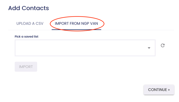 - If you are using an NGP VAN integration, you are required to include VANids for all contacts on a particular list. Having contacts without a VANid will result in an error and you will not be able to continue. For more information about setting up your NGP VAN integration, read the “Using Your NGP VAN Integration” guide.