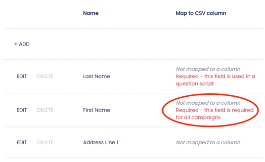 *Important: you do not need to map every column header from the CSV you uploaded to a Contact Field, but rather just the “First Name” field (which is required for all call campaigns) and any fields you’d like to insert as Contact Fields into your script.