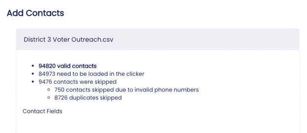 - Contacts that were skipped:The number of contacts that were not imported into the dialer, for the reasons enumerated below.