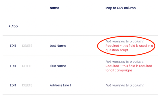 - Once you have finished setting up your call campaign and have launched it, if you wish to go back and insert additional Contact Fields into your call script, you will be required to first map these additional Contact Fields to their corresponding CSV column header in this step (Step 4) before you will be able to return to Step 3 and insert these Contact Fields into your script.
