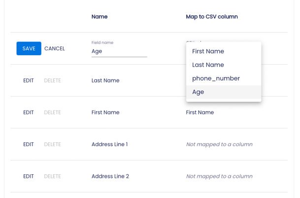 An example of adding a new Contact Field — “Age” — in the column mapping step of contact upload.