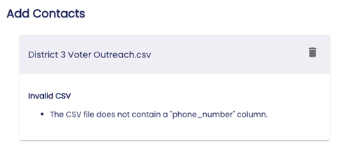 An example of the error message if the CSV you’ve attempted to upload doesn’t have a properly named ‘phone_number’ column.