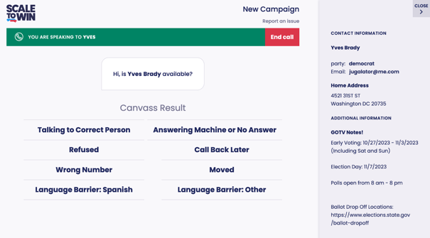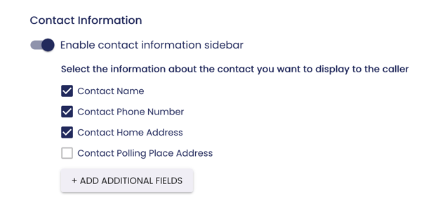 You can show your callers contact specific details like polling place names, email addresses, voter addresses, custom contact information, and more pulled from your uploaded contact list. When using a VAN Integration for your contact list, the data you want to display will need to be included in your Saved List in VAN.