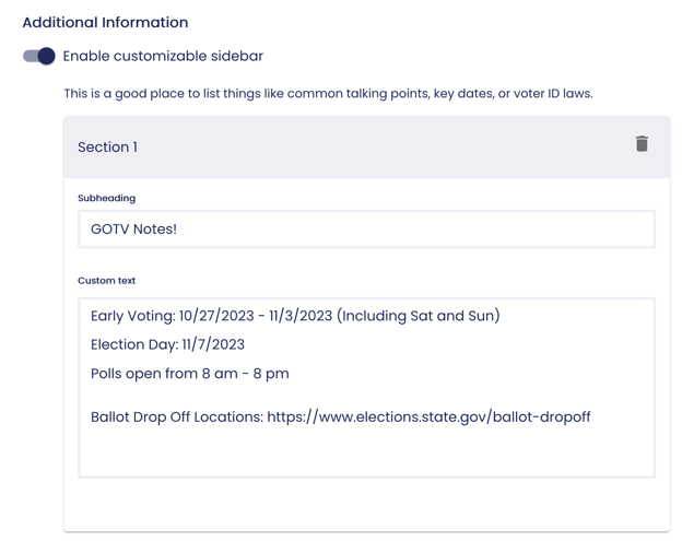 The Additional Information section of the Caller Sidebar Step with one section on GOTV Notes that will display for callers.